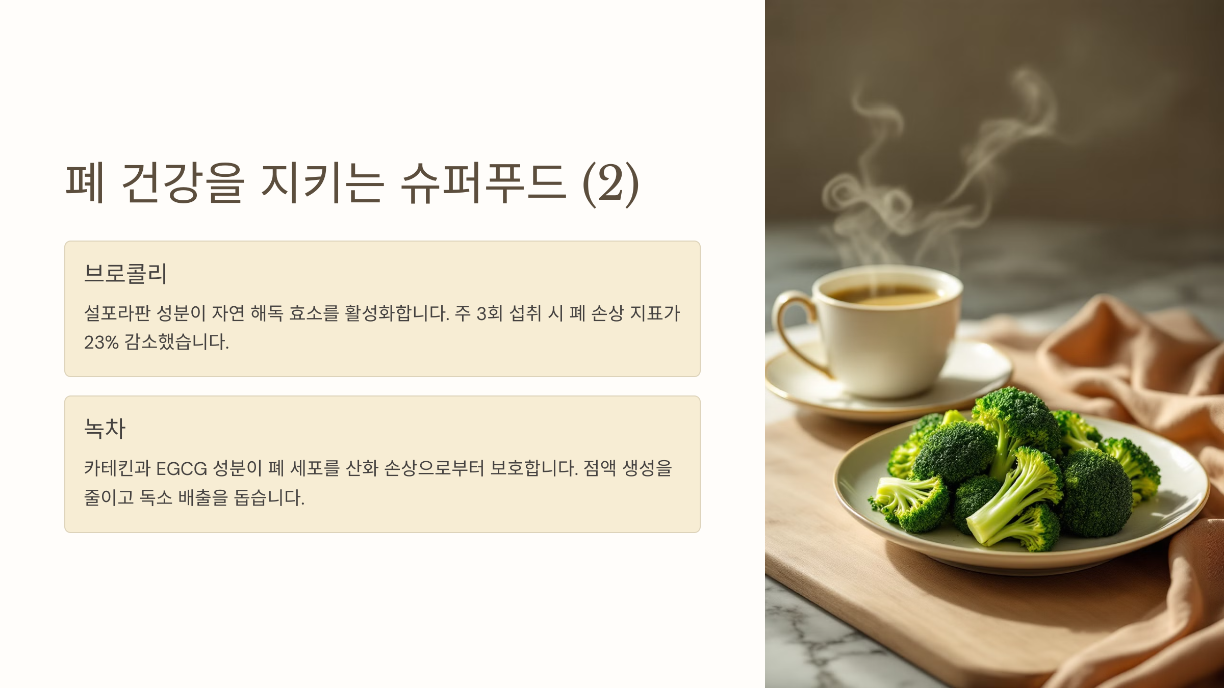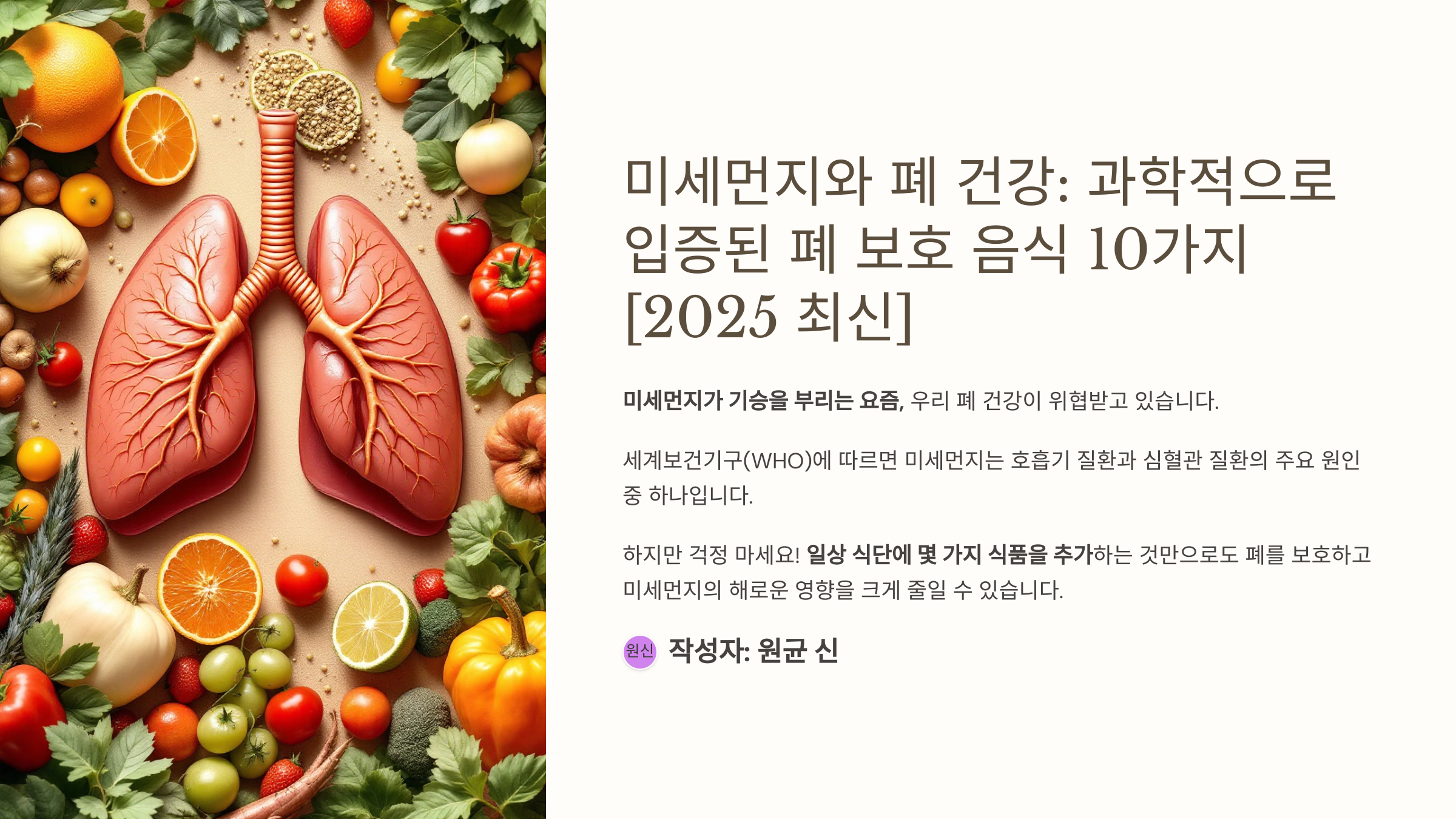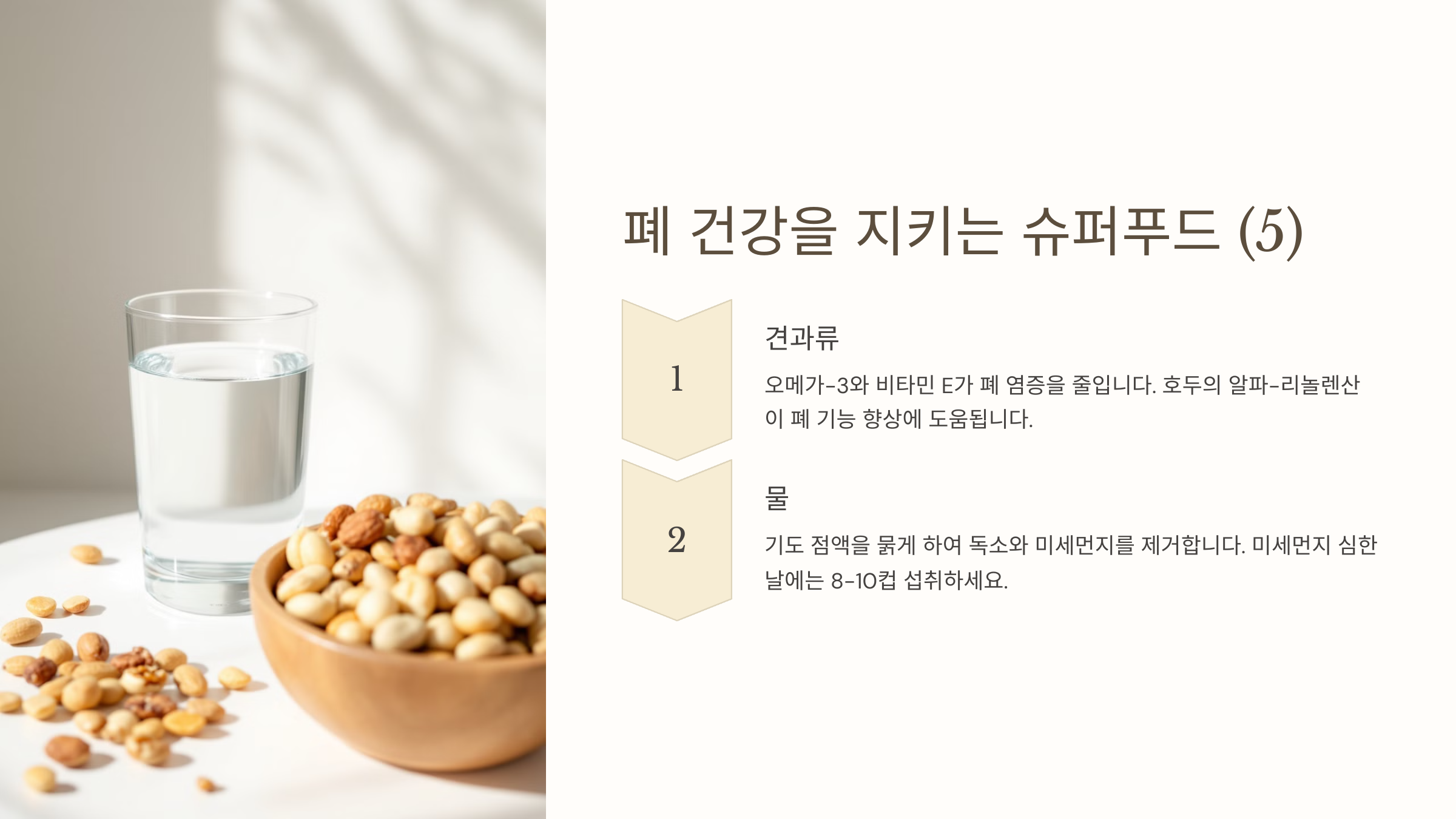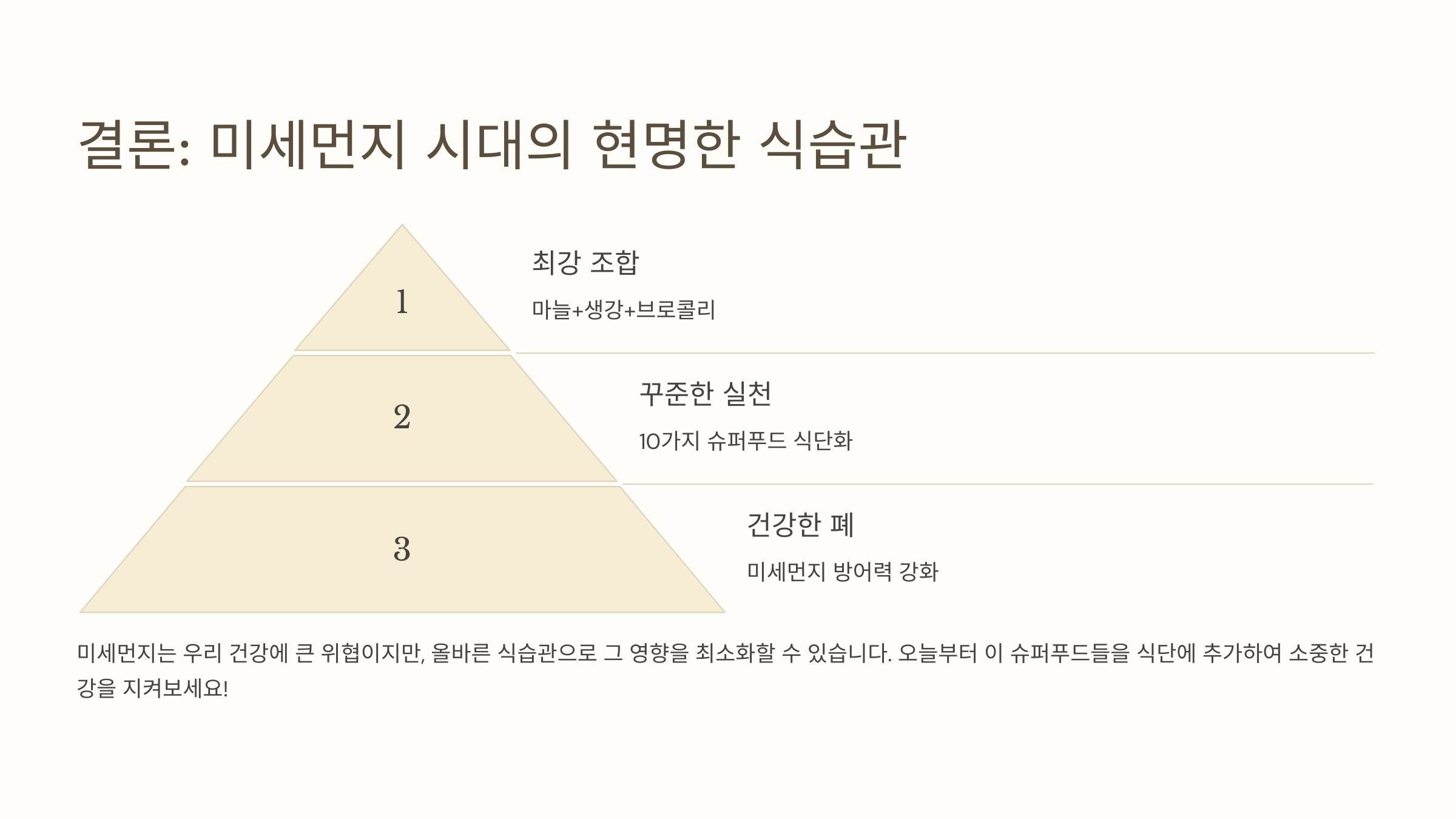 미세먼지는 우리 건강에 큰 위협이지만, 올바른 식습관으로 그 영향을 최소화할 수 있습니다. 위에서 소개한 10가지 음식을 일상 식단에 꾸준히 포함시키면 폐 건강을 효과적으로 지킬 수 있습니다. 특히 마늘, 생강, 브로콜리의 조합은 항산화, 항염증 효과를 극대화하여 폐를 미세먼지로부터 보호하는 최강의 방패가 됩니다.