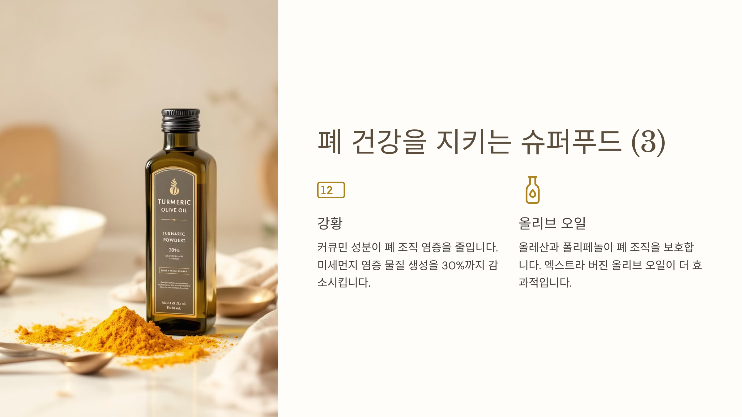 올리브 오일에 함유된 올레산과 폴리페놀은 폐 조직을 보호하고 염증을 완화하는데 효과적입니다. 엑스트라 버진 올리브 오일은 항산화 성분이 더 풍부하여, 미세먼지에 노출된 폐 세포의 회복을 도와줍니다. 매일 1-2큰술의 올리브 오일을 샐러드나 요리에 추가하세요.