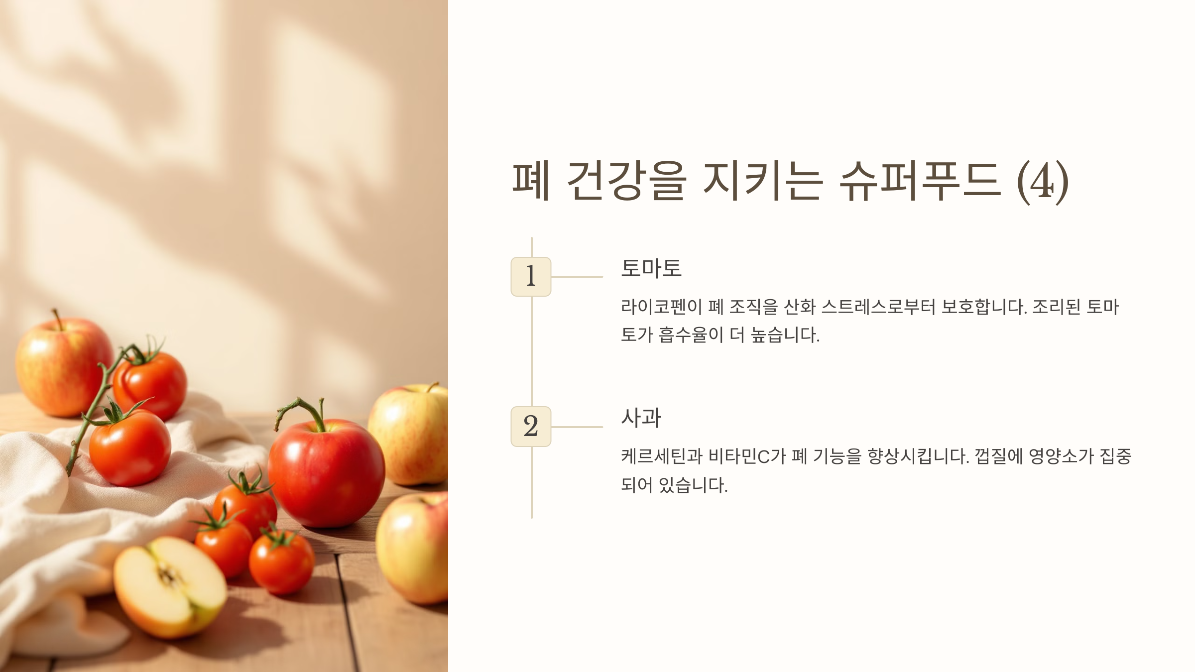 토마토에 풍부한 라이코펜은 폐 조직을 산화 스트레스로부터 보호하는 강력한 항산화제입니다. 2024년 연구에 따르면, 토마토를 꾸준히 섭취한 그룹은 폐 기능 검사에서 건강한 수치를 유지할 확률이 25% 높았습니다. 라이코펜은 조리된 토마토에서 더 잘 흡수되므로 토마토 소스나 수프로 섭취하는 것이 효과적입니다.