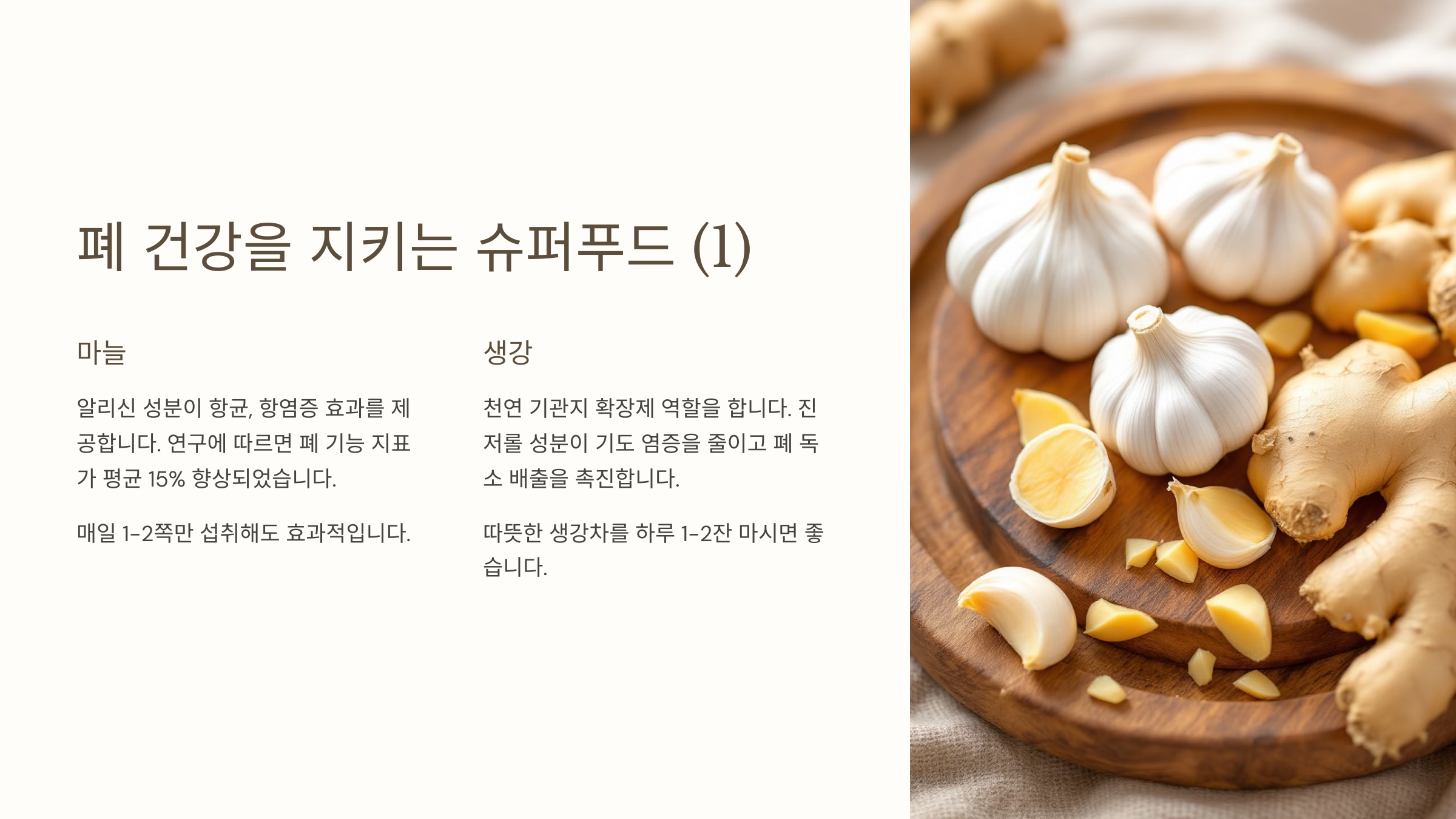 마늘에 함유된 알리신은 강력한 항균, 항염증 성분으로 폐의 감염을 예방하고 면역력을 향상시킵니다. 2023년 발표된 연구에 따르면, 마늘을 꾸준히 섭취한 그룹은 폐 기능 지표가 평균 15% 향상되었습니다. 매일 1-2쪽의 마늘을 음식에 추가하는 것만으로도 효과를 볼 수 있습니다.