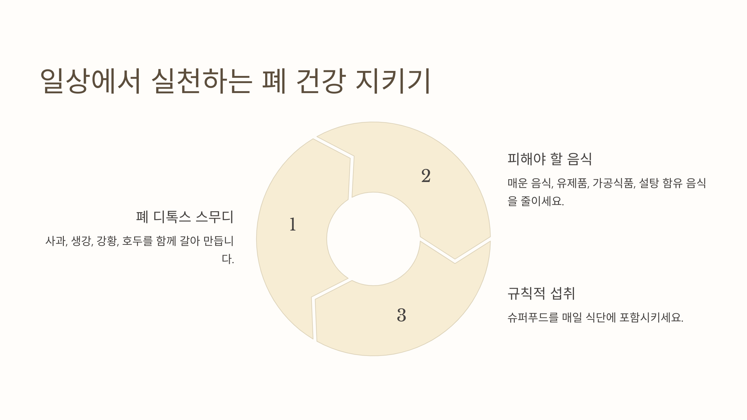 미세먼지가 심한 날에는 위의 음식들을 조합한 '폐 디톡스 스무디'를 만들어 마시는 것도 좋은 방법입니다. 사과, 생강, 강황 약간, 호두를 함께 갈아 만든 스무디는 폐 건강에 필요한 영양소를 한 번에 공급합니다.