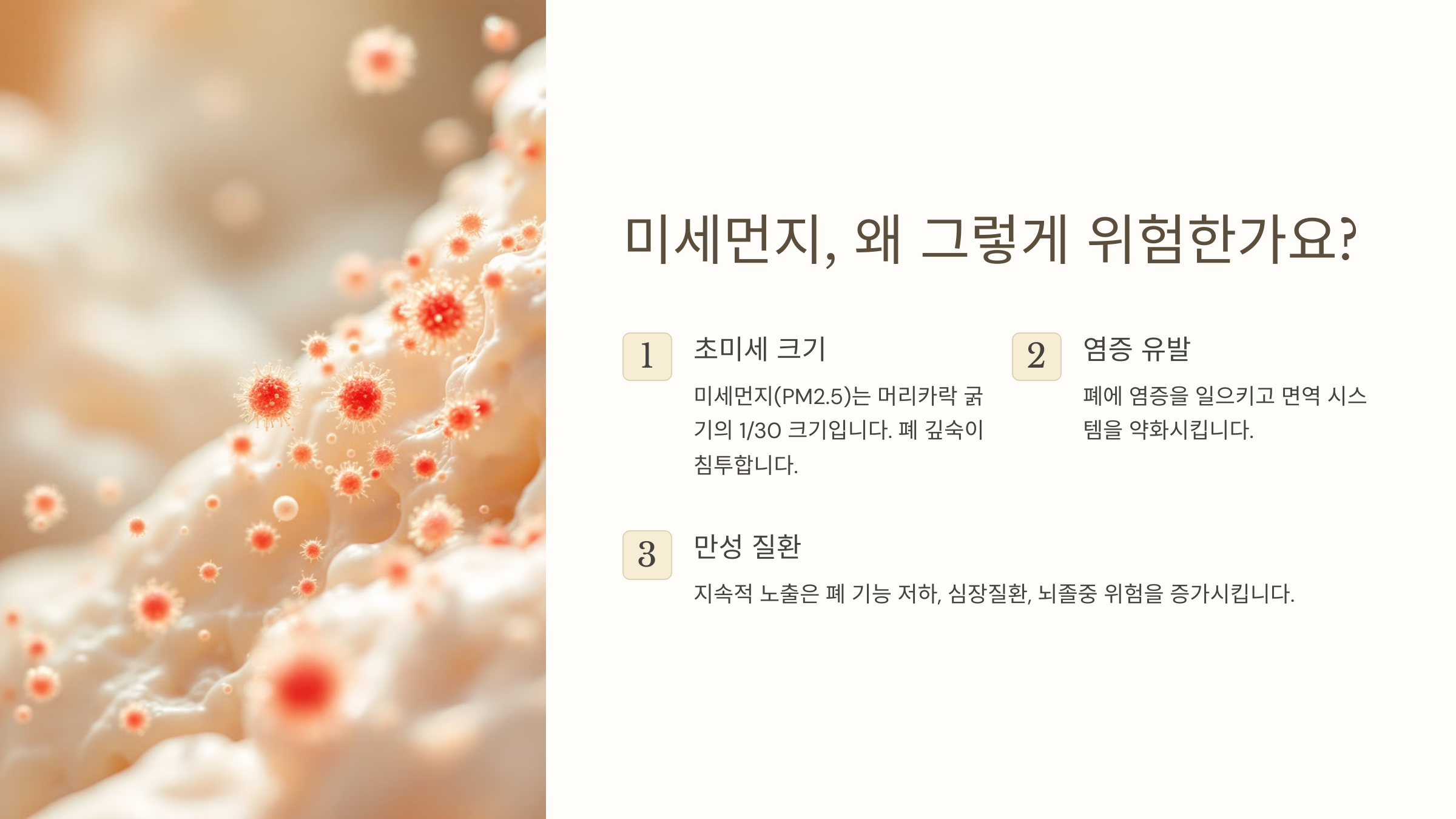 미세먼지(PM2.5)는 머리카락 굵기의 1/30 크기로, 폐 깊숙이 침투해 염증을 일으키고 면역 시스템을 약화시킵니다. 최근 연구에 따르면, 지속적인 미세먼지 노출은 폐 기능 저하뿐만 아니라 심장질환, 뇌졸중 위험까지 증가시킵니다. 하지만 올바른 영양소를 섭취하면 몸의 자연적인 방어 시스템을 강화할 수 있습니다.