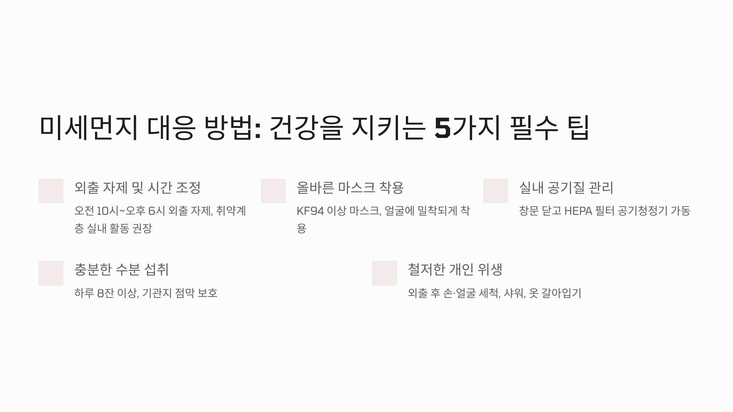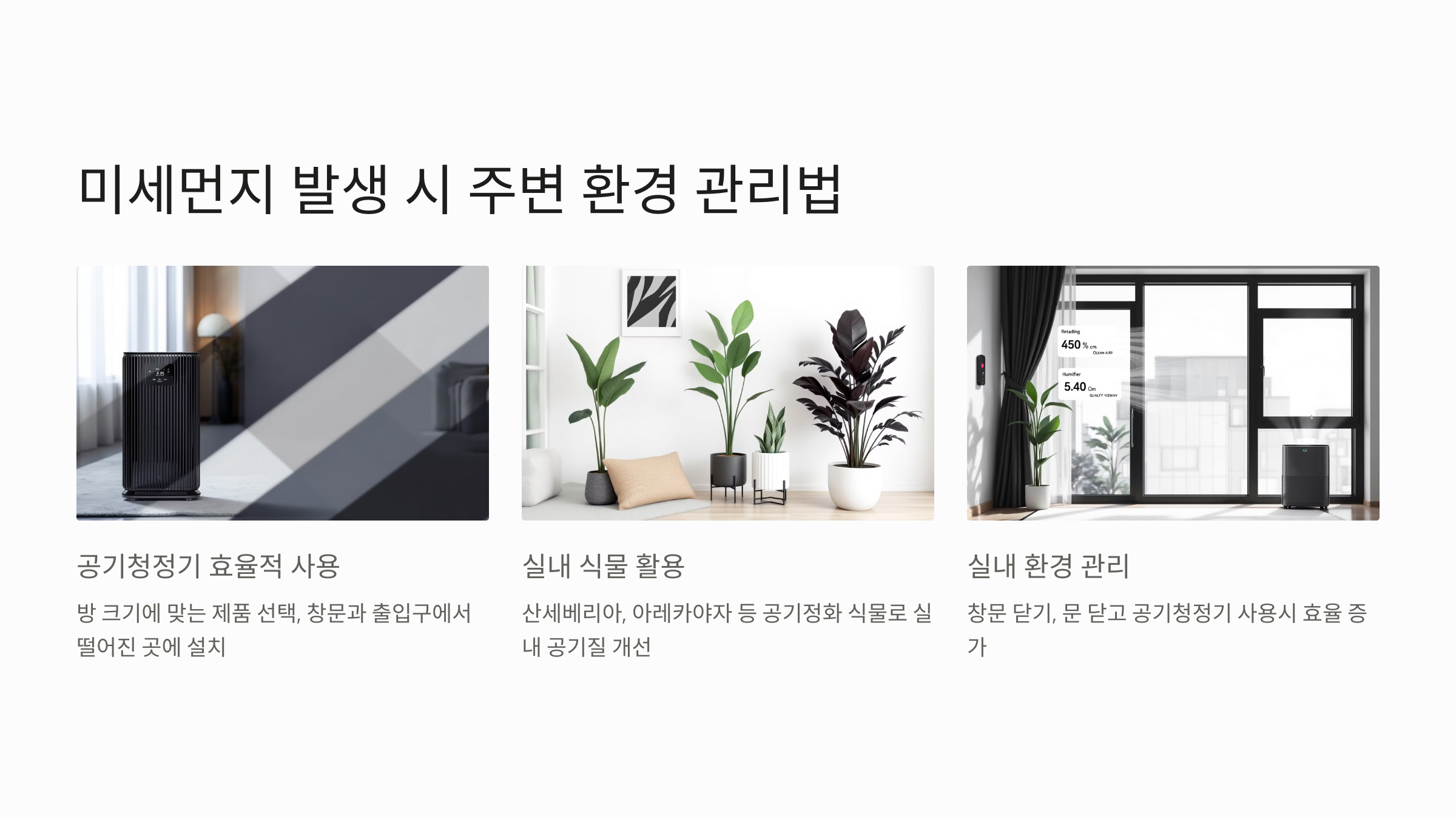 - 실내 공기질 관리 - 미세먼지가 심한 날에는 창문을 닫고, 공기청정기를 가동하세요. 공기청정기는 HEPA 필터가 장착된 제품을 선택하고, 필터 관리를 정기적으로 해야 효과적입니다.