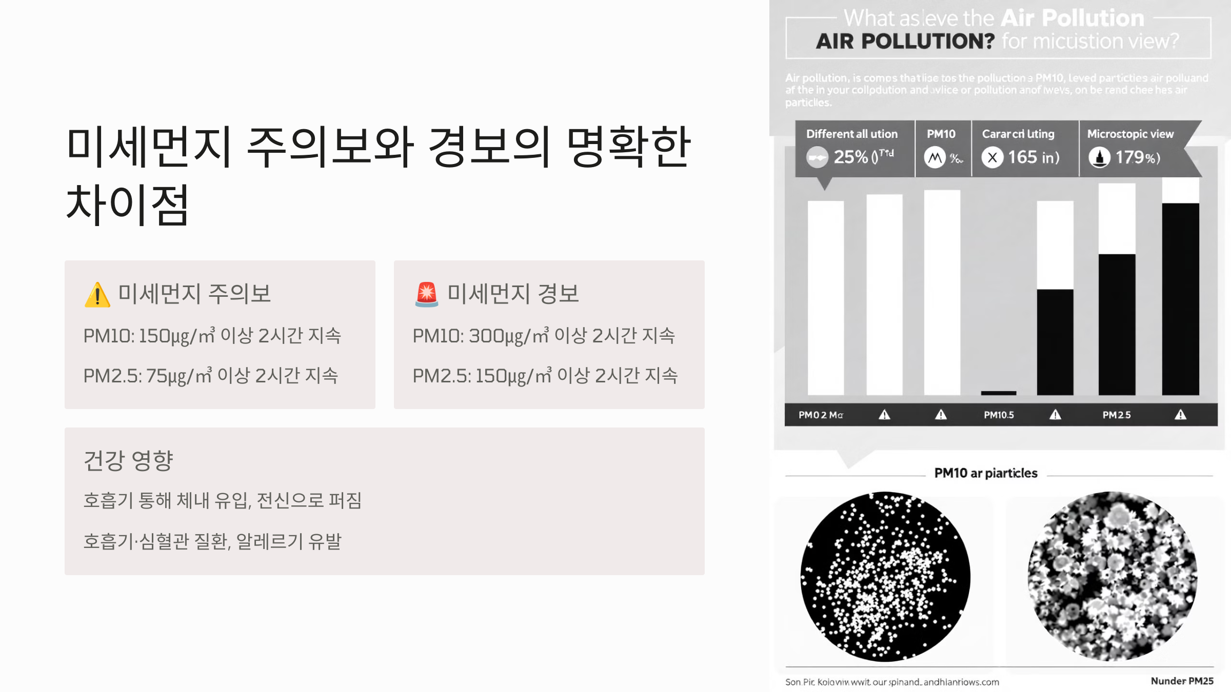 최근 들어 미세먼지 주의보와 미세먼지 경보가 빈번하게 발령되면서 건강에 대한 우려가 커지고 있습니다. 그렇다면 이 두 가지는 어떤 차이가 있고, 우리는 어떻게 대응해야 할까요? 이 글에서는 미세먼지 주의보와 경보의 정확한 차이점과 건강을 지키기 위한 효과적인 대응 방법을 알아보겠습니다.
