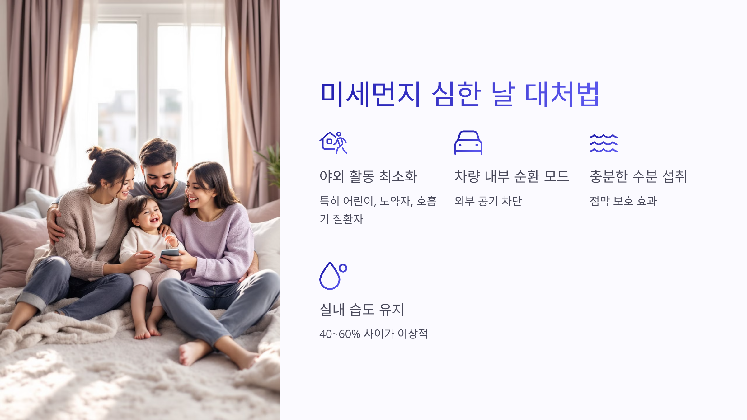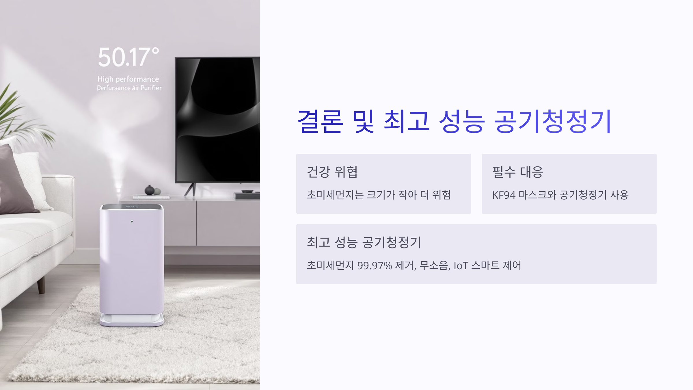 - HEPA 필터 공기청정기 가동 - 실내 공기질 유지에 필수