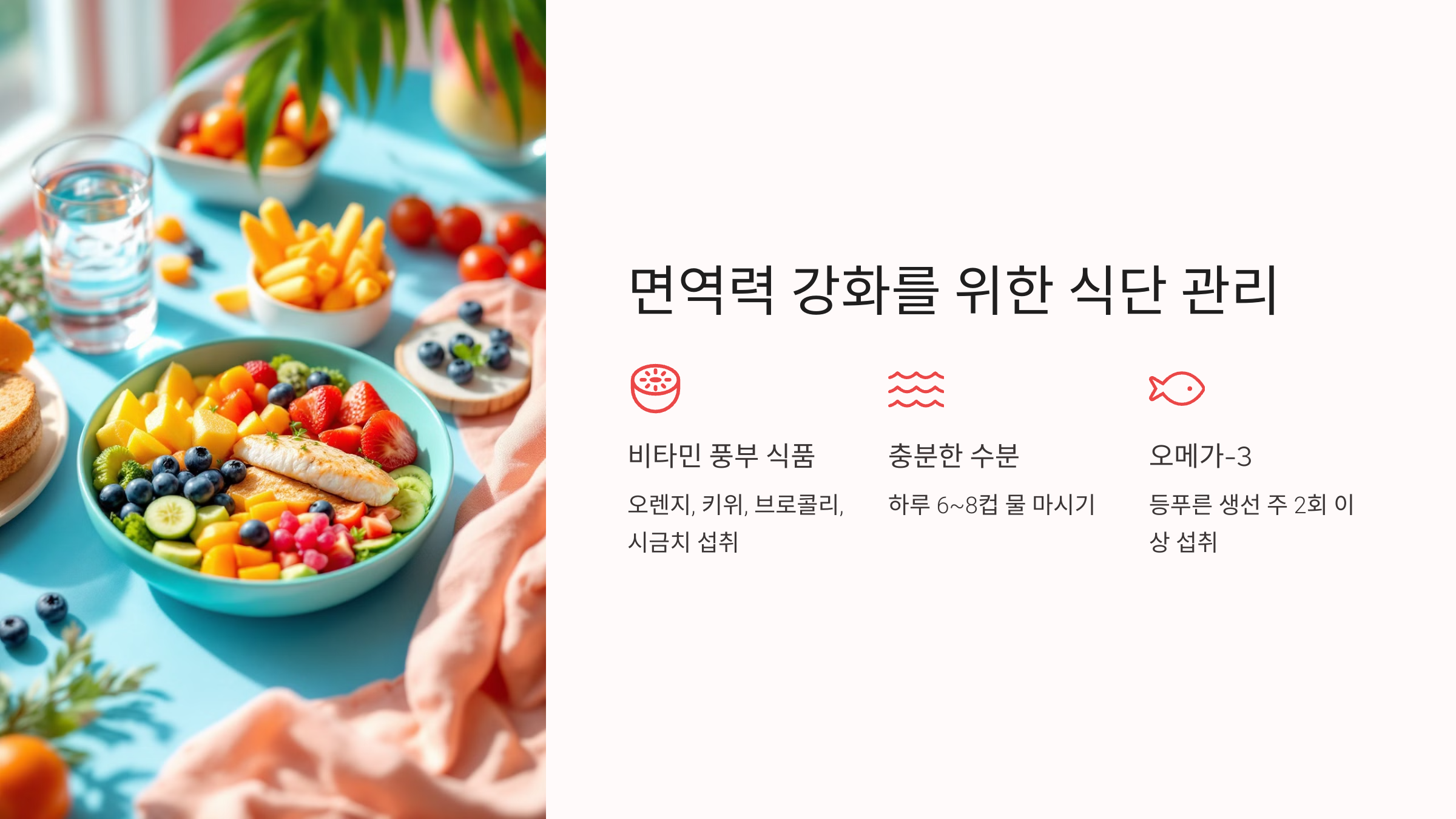 비타민 C, E가 풍부한 과일과 채소를 충분히 섭취하면 미세먼지로 인한 염증 반응을 줄일 수 있습니다. 오렌지, 키위, 브로콜리, 시금치 등을 매일 식단에 포함시키고, 물을 하루 6~8컵 마시도록 해주세요.