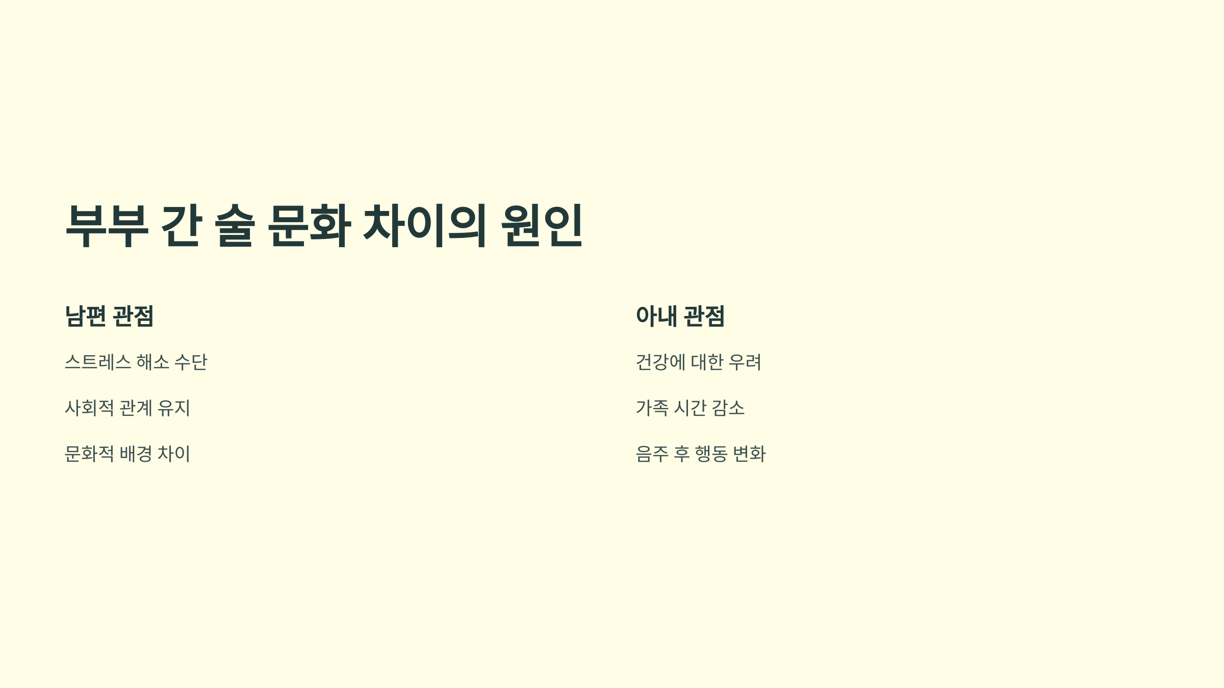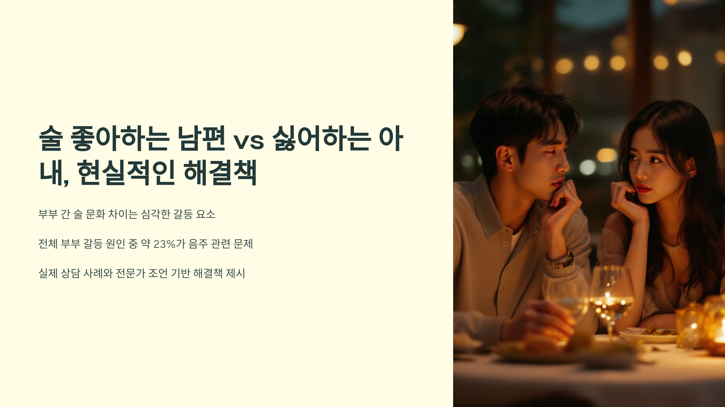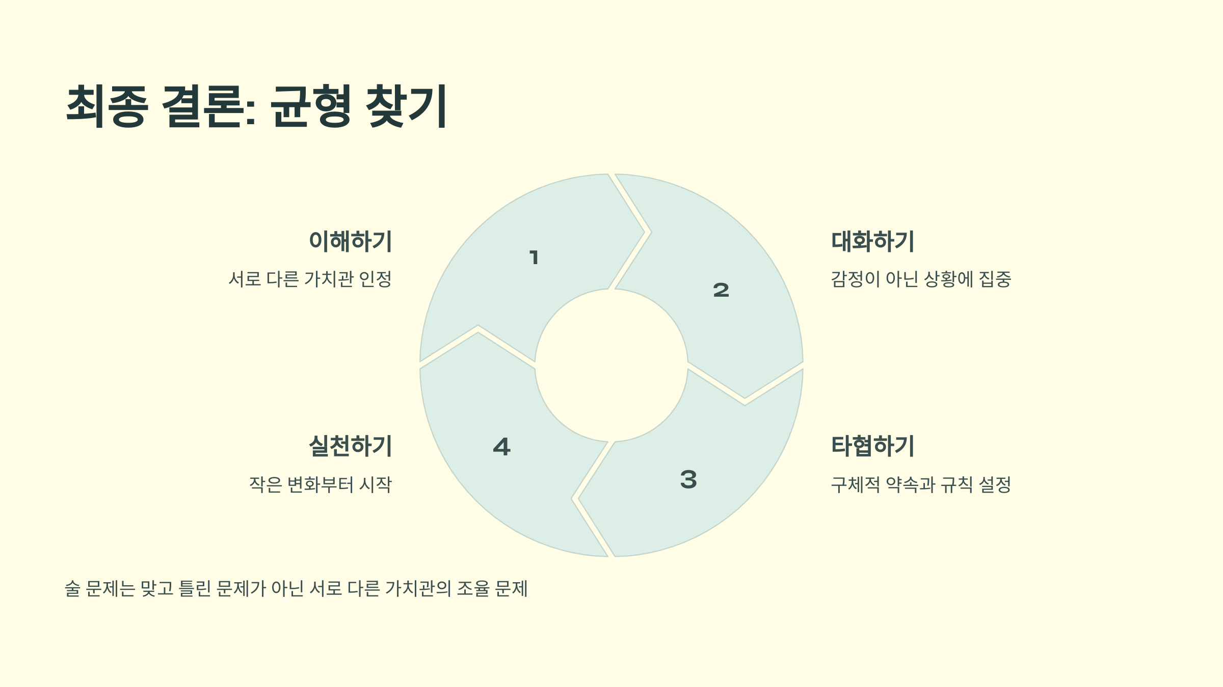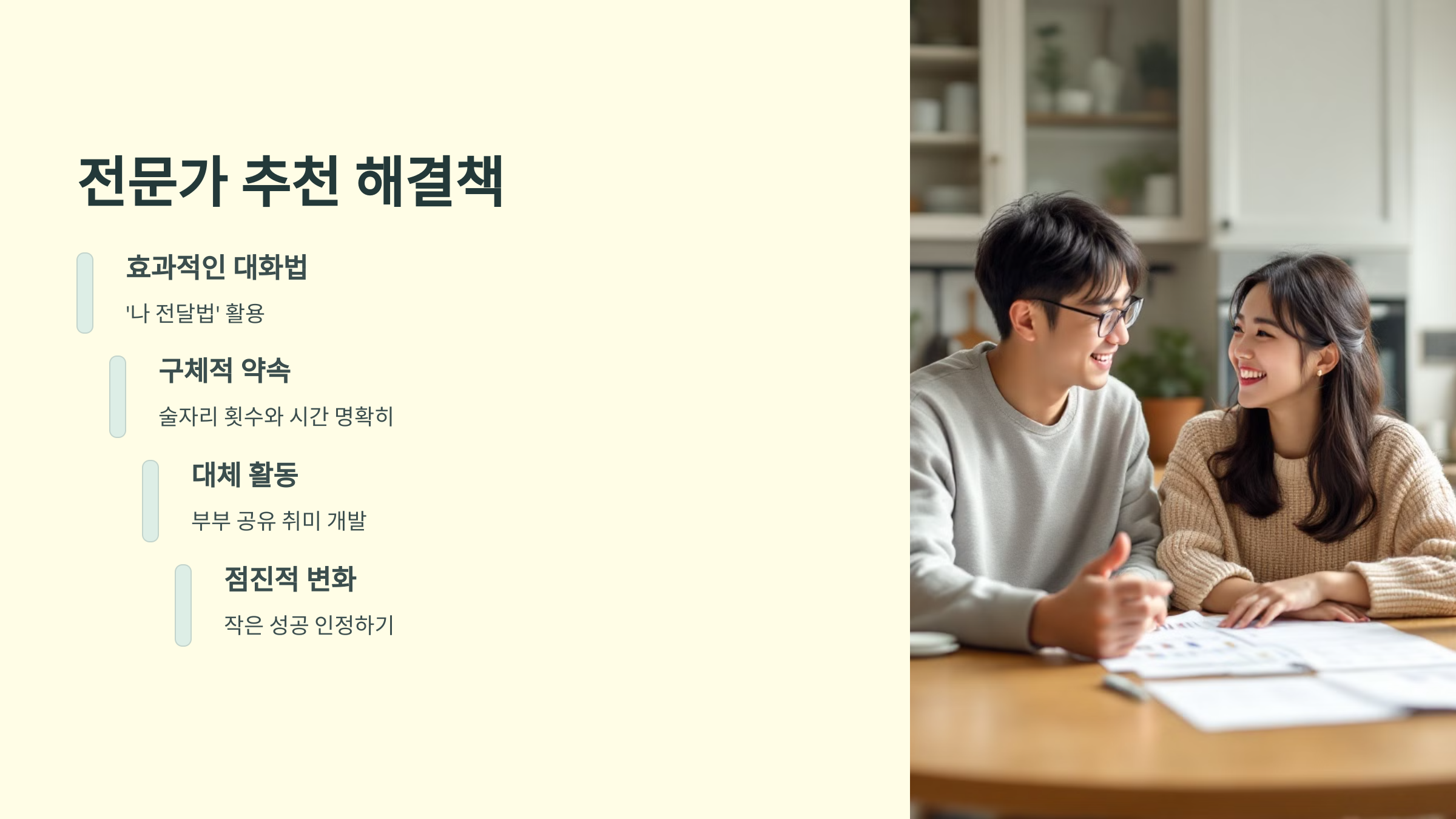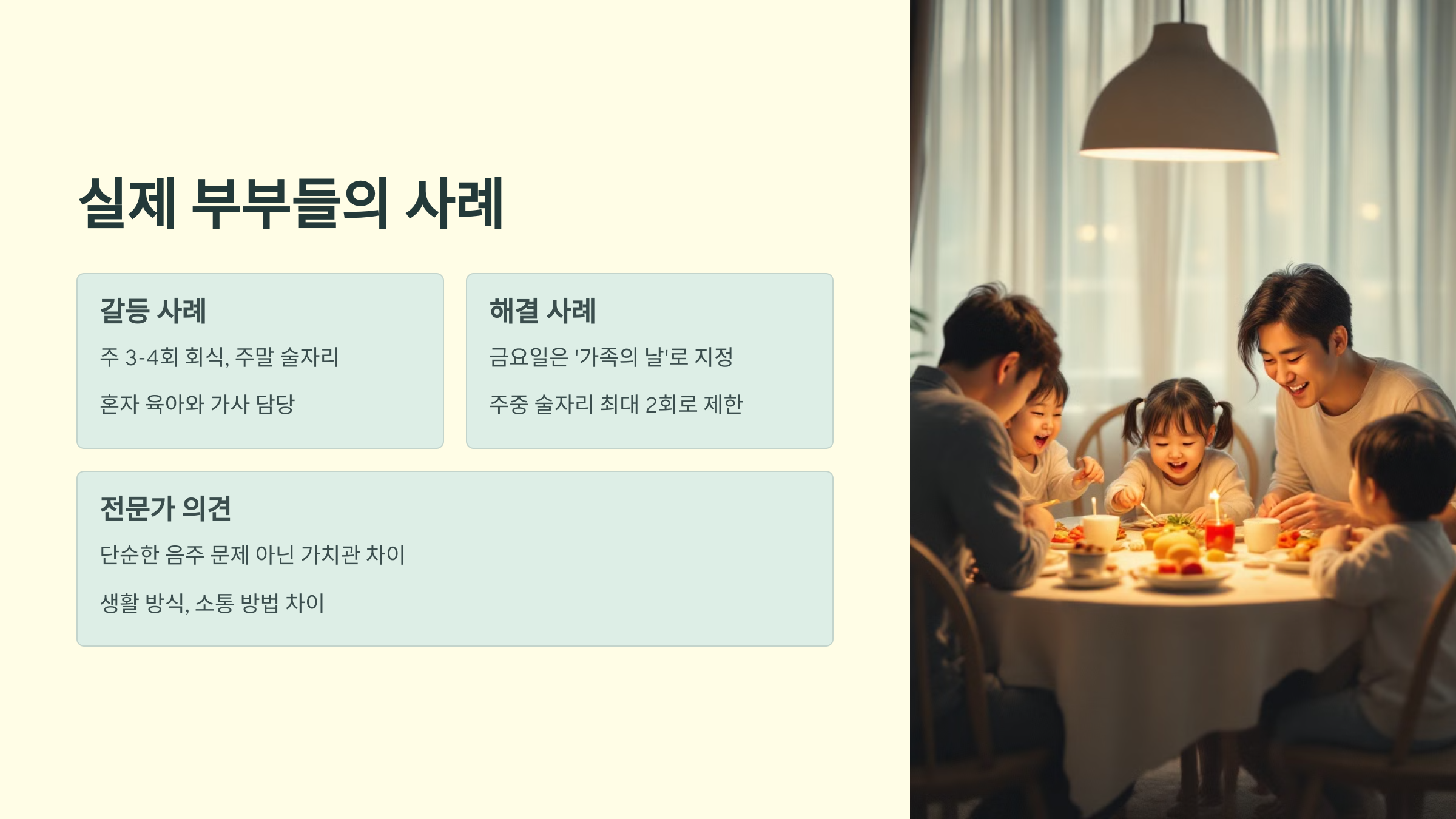 술을 즐기는 남편은 가족과의 시간과 약속의 중요성을, 술을 싫어하는 아내는 상대방의 스트레스 해소 방식을 이해하려는 노력이 필요합니다. 균형 잡힌 접근이 장기적인 부부 관계 개선의 열쇠입니다.