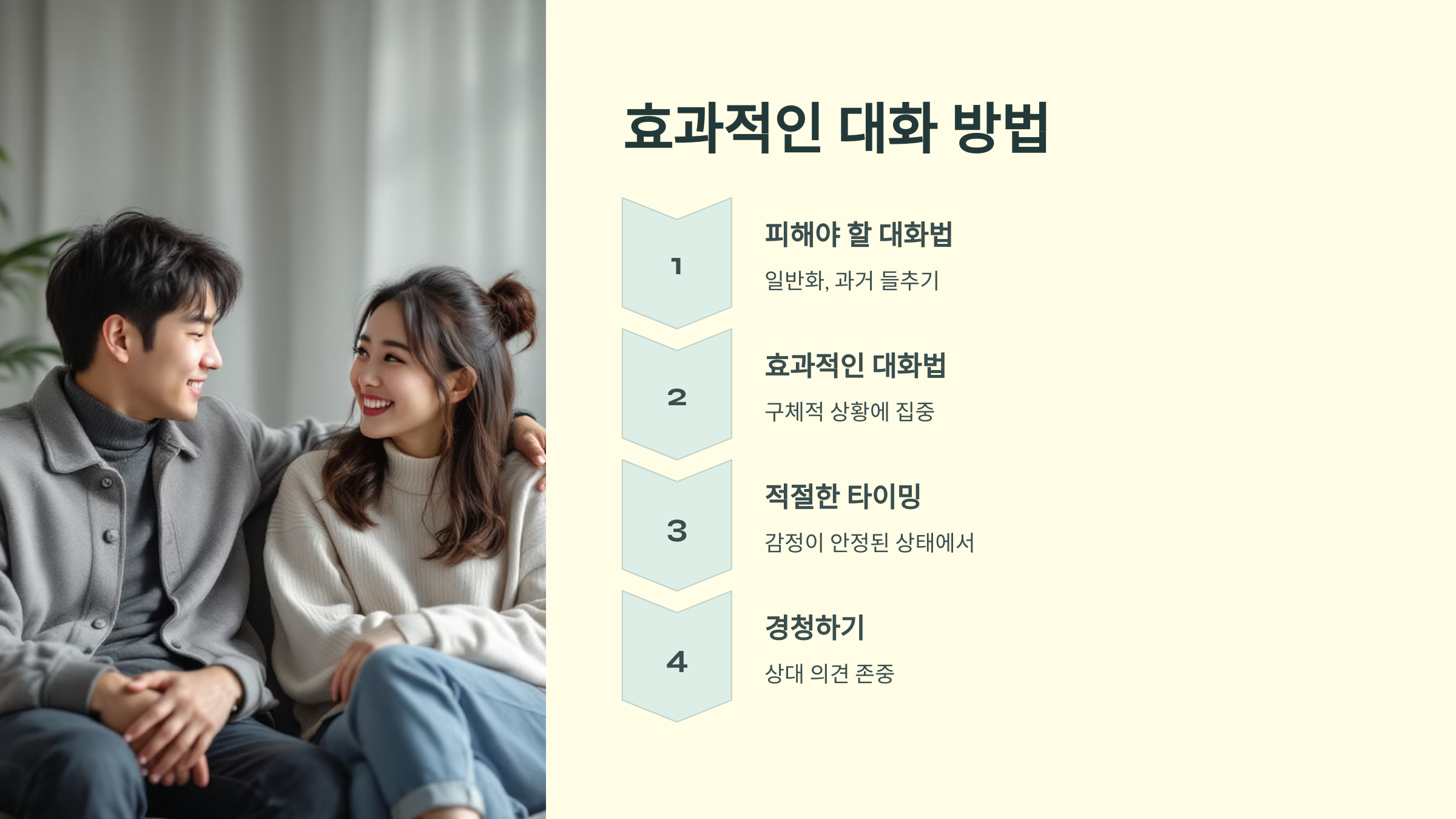 대화 팁: "당신이 술을 마셔서 화가 나" 대신 "당신이 늦게 들어오면 걱정이 돼요"와 같이 자신의 감정에 집중하세요.