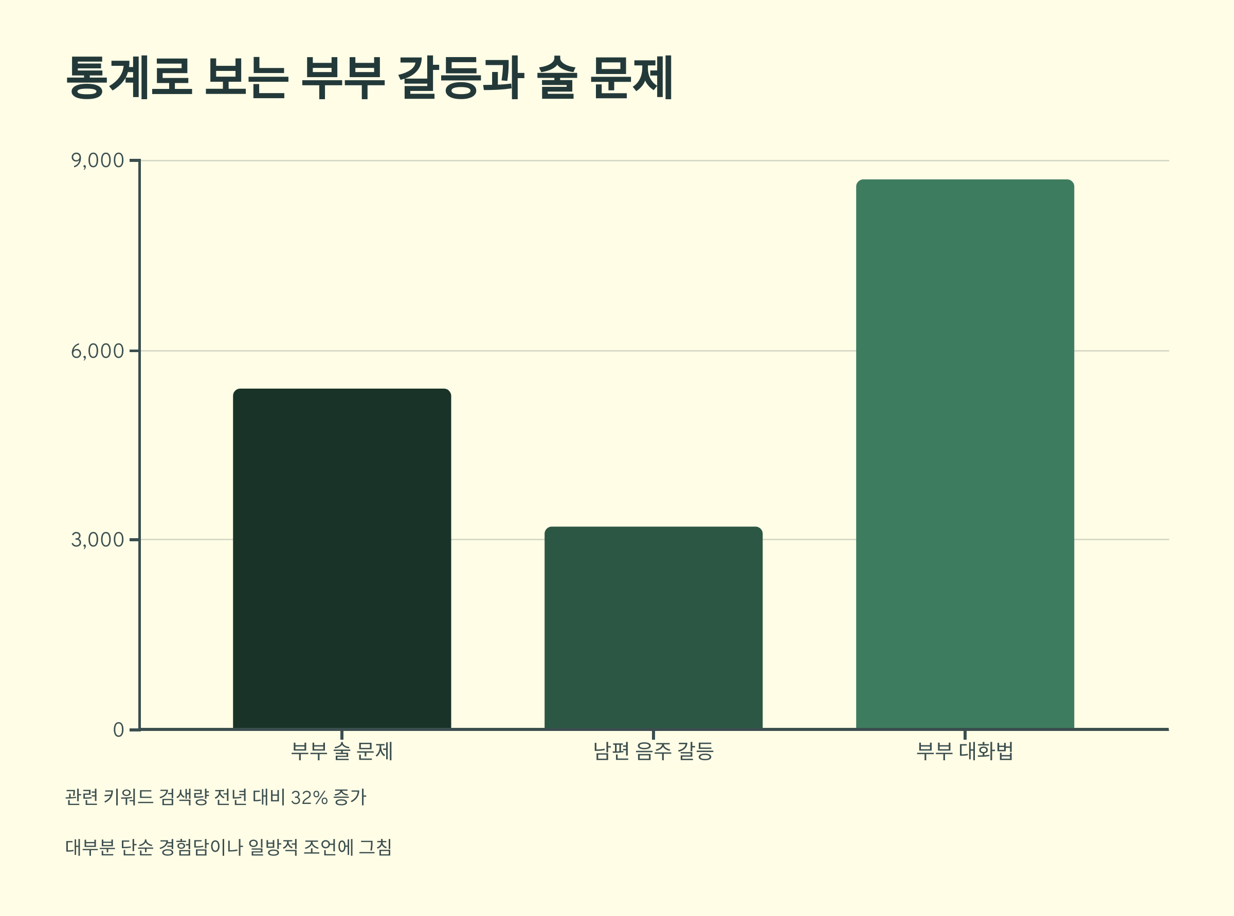 최근 네이버와 구글의 검색 트렌드를 분석한 결과, '부부 술 문제', '남편 음주 갈등', '부부 대화법' 등의 키워드 검색량이 전년 대비 32% 증가했습니다.