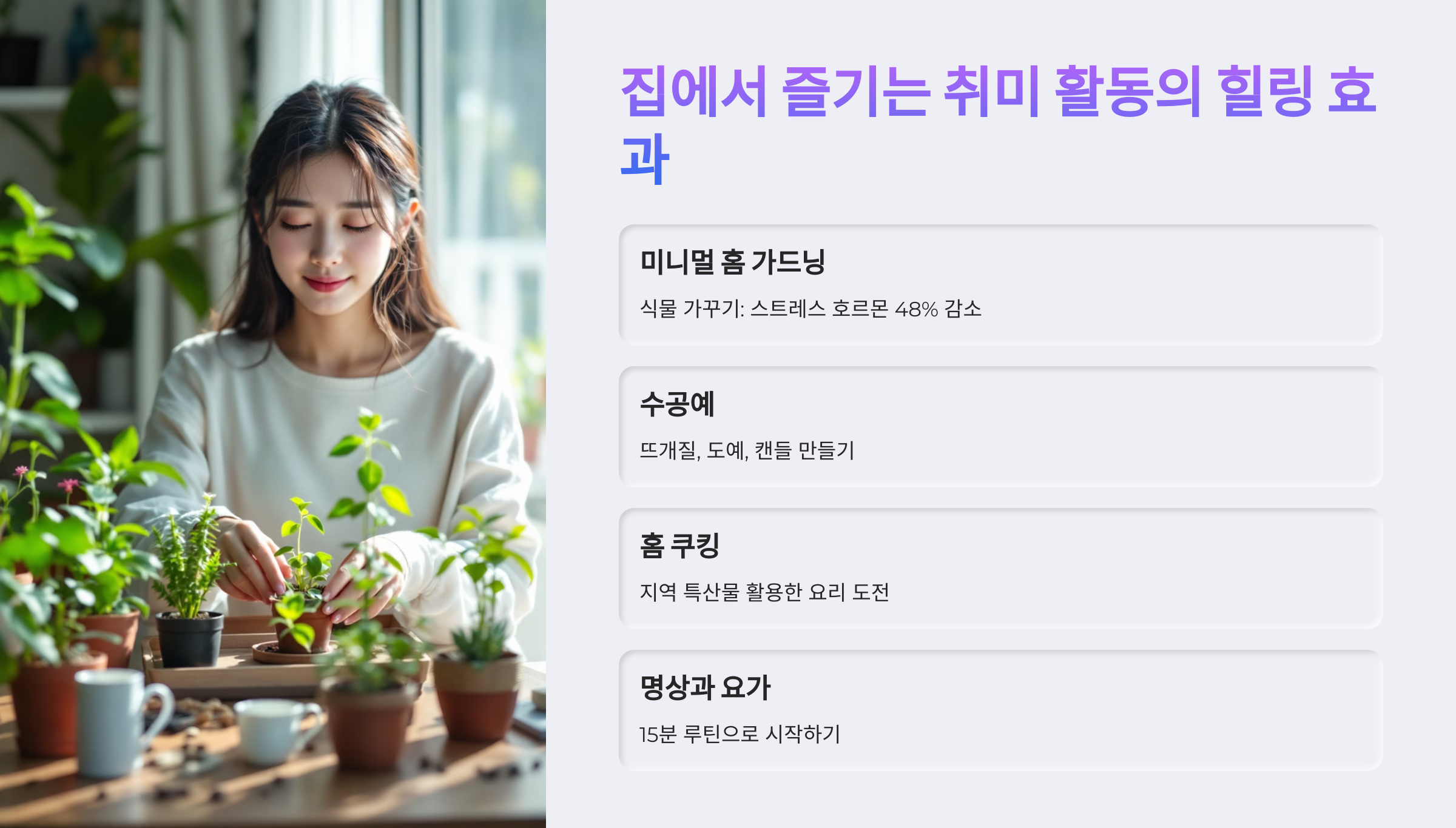홈 가드닝, 요리, 독서와 같은 취미 활동은 단순한 휴식을 넘어 성취감까지 제공합니다. 특히 식물 가꾸기는 스트레스 호르몬을 48%까지 낮추는 효과가 있습니다.