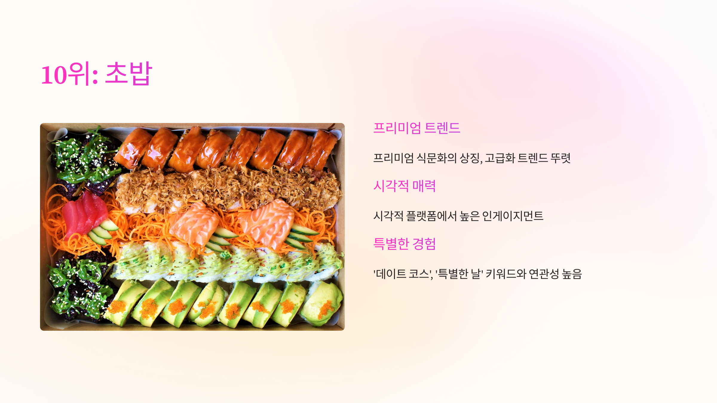 프리미엄 식문화 확산과 함께 고급화 트렌드가 뚜렷한 메뉴입니다. 인스타그램 등 시각적 플랫폼에서 특히 높은 인게이지먼트를 보이며, '데이트 코스', '특별한 날'과 같은 키워드와 연관성이 높습니다.