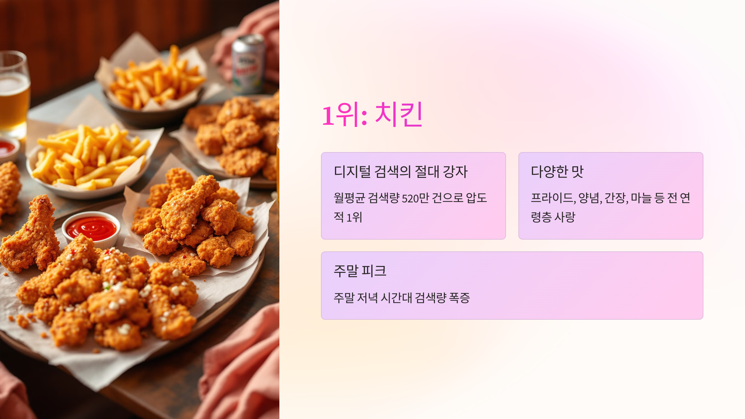프라이드, 양념, 간장, 마늘 등 다양한 맛으로 전 연령층에게 사랑받는 국민 메뉴입니다. 디지털 플랫폼에서 월평균 검색량 520만 건으로 압도적 1위를 차지했습니다. 특히 주말 저녁 시간대에 검색량이 폭증하는 패턴을 보이며, 배달앱에서 가장 높은 클릭률을 기록하고 있습니다.