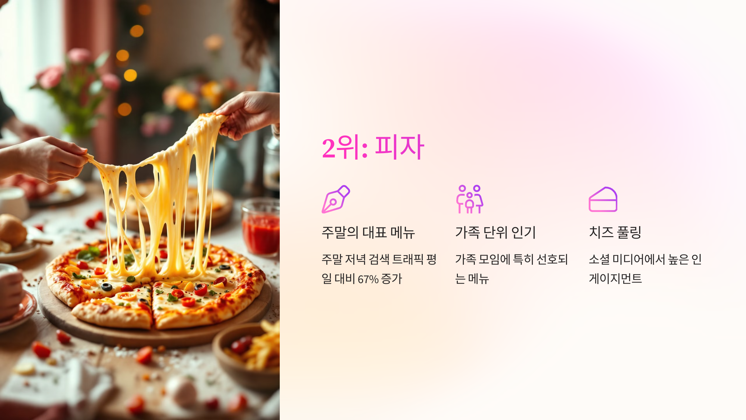 전통적인 이탈리안 스타일부터 한국적 토핑까지 다양한 변주가 가능한 메뉴입니다. 주말 저녁 검색 트래픽이 평일 대비 67% 증가하는 특징이 있으며, 가족 단위 소비자들에게 특히 인기가 높습니다. 소셜 미디어에서는 '치즈 풀링' 영상과 함께 높은 인게이지먼트를 보입니다.