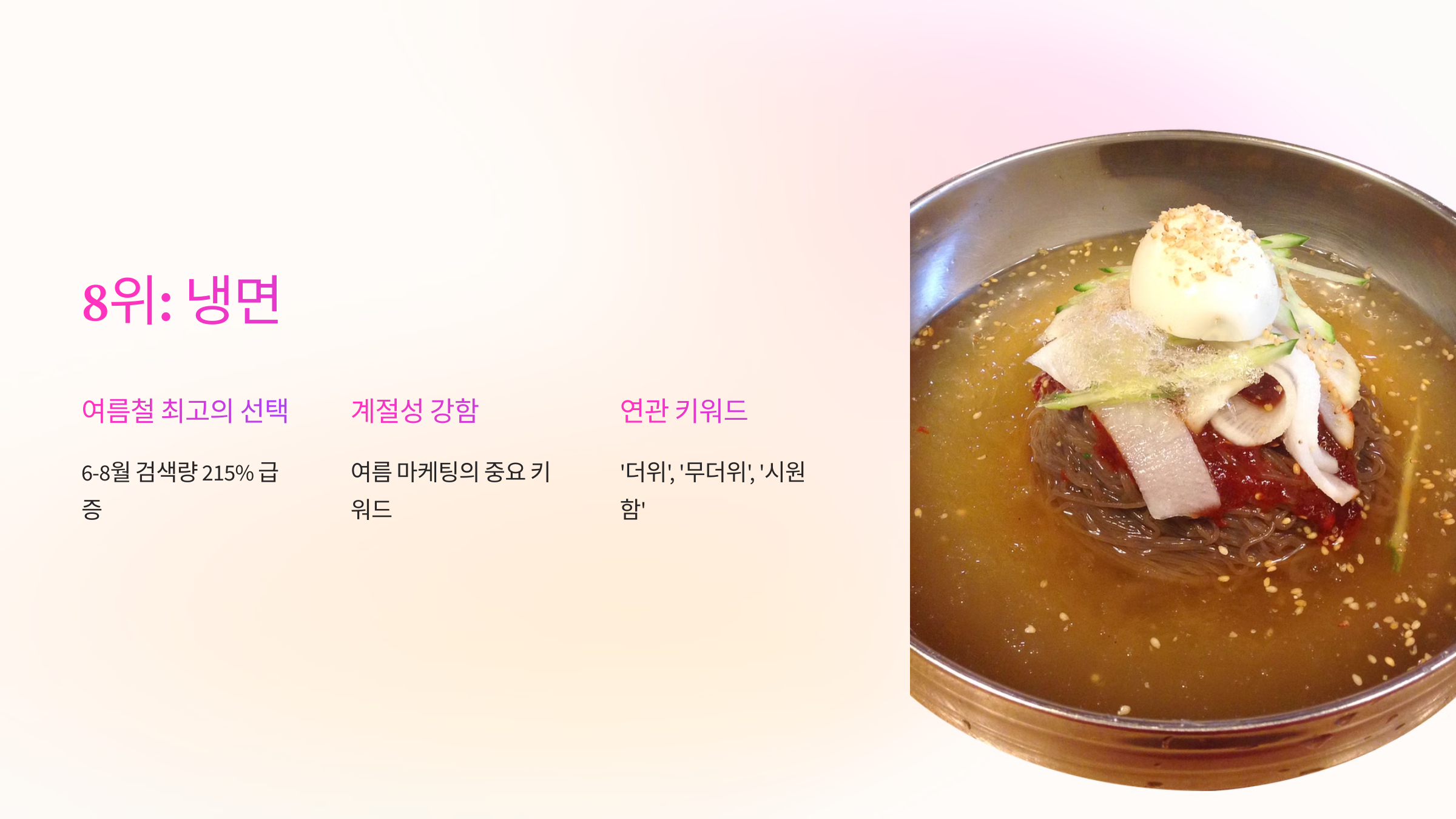 여름철 시원한 국물 요리의 대표주자입니다. 6월부터 8월까지 검색량이 연평균 대비 215% 급증하는 강한 계절성을 보입니다. '더위', '무더위', '시원함'과 같은 키워드와 높은 연관성을 가지며, 여름 마케팅의 중요 키워드로 활용됩니다.