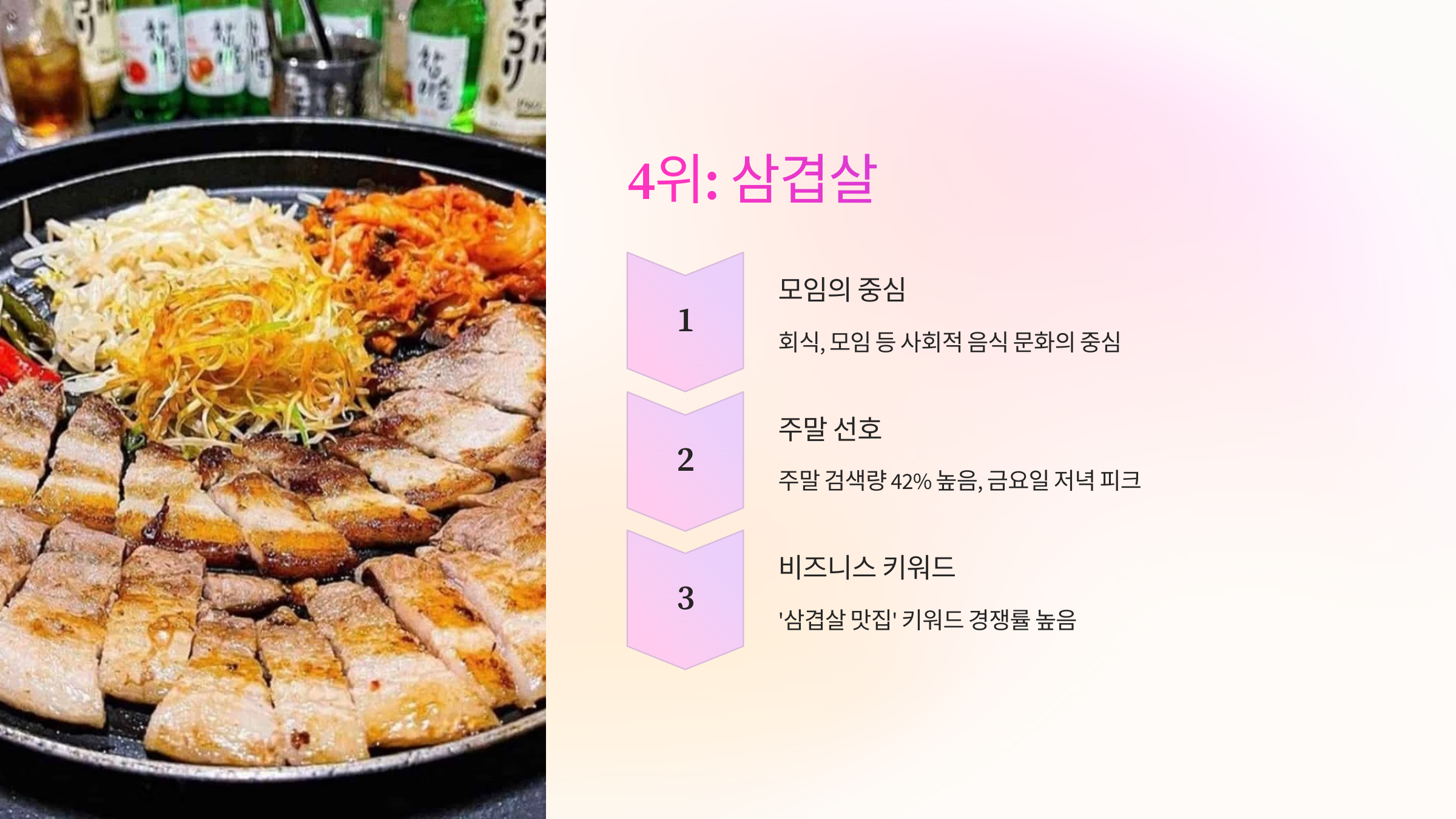 회식, 모임 등 사회적 음식 문화의 중심에 있는 메뉴입니다. 주중보다 주말 검색량이 42% 높으며, 특히 금요일 저녁 시간대에 검색 피크를 보입니다. '삼겹살 맛집'이라는 키워드의 경쟁률이 매우 높아 지역 검색에서 중요한 비즈니스 키워드로 자리잡았습니다.