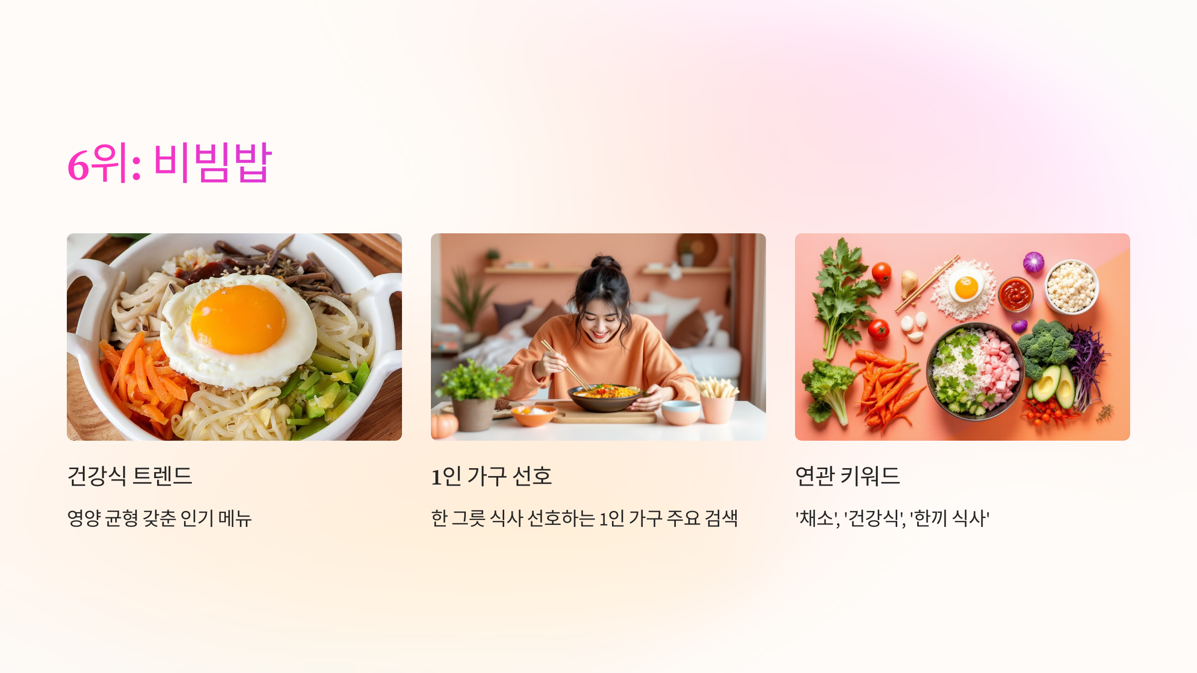 건강식을 찾는 트렌드와 함께 인기 상승 중인 메뉴입니다. 영양 균형과 한 그릇 식사를 선호하는 1인 가구의 주요 검색 키워드로 자리잡았습니다. '채소', '건강식', '한끼 식사'와 같은 키워드와 함께 검색되는 경우가 많습니다.