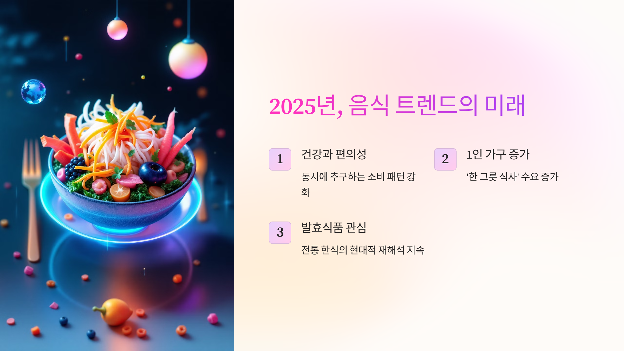 1인 가구 증가와 함께 '한 그릇 식사'에 대한 수요가 늘어나고, 발효식품의 건강 효능에 대한 관심이 높아지면서 전통 한식의 현대적 재해석이 계속될 것으로 보입니다.
