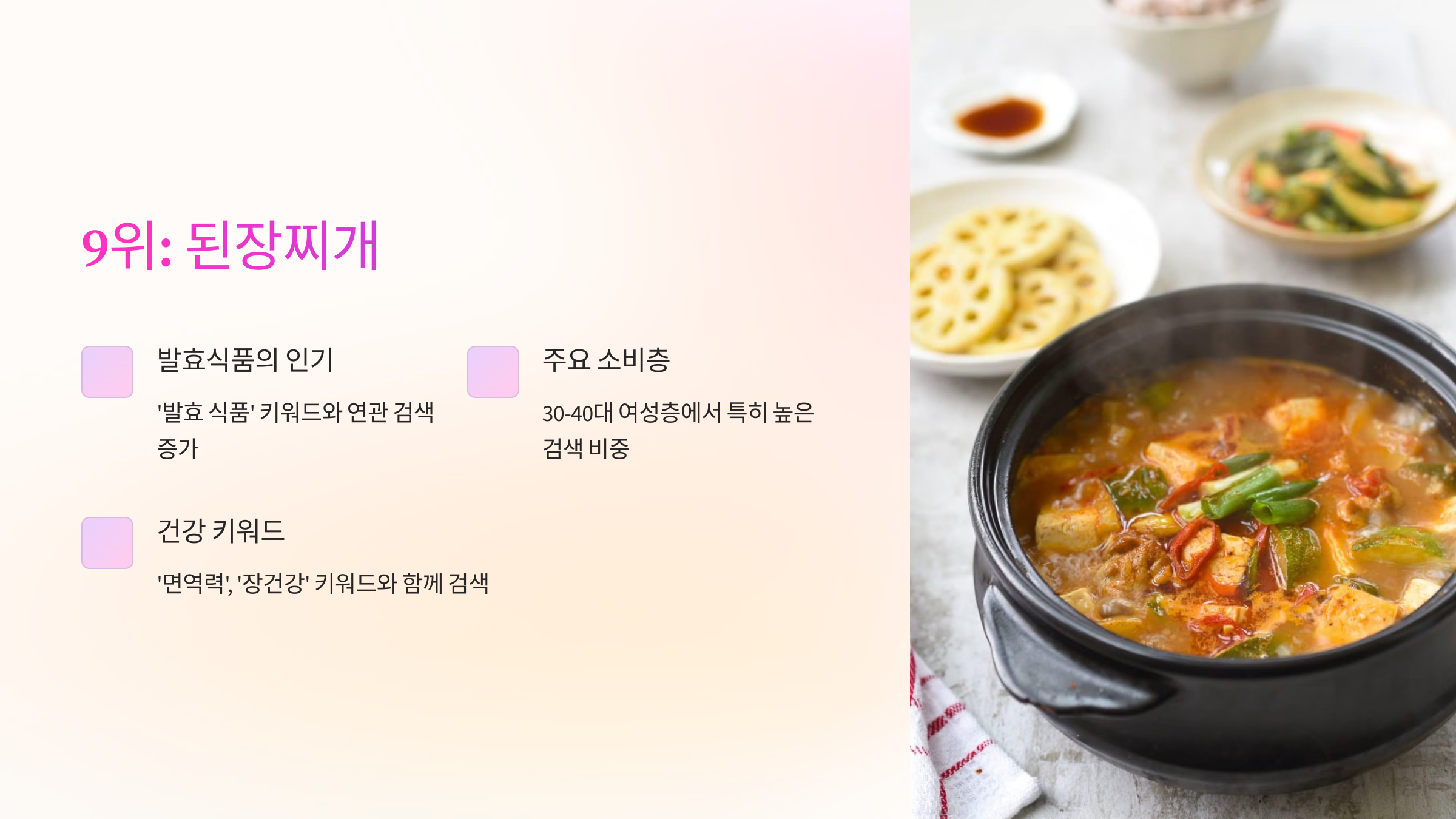 한국인의 일상 식단에서 빼놓을 수 없는 대표 메뉴입니다. 날씨가 추워지는 10월부터 2월까지 검색량이 연평균 대비 38% 증가하는 뚜렷한 계절성을 보입니다. '집밥', '엄마 요리'와 같은 키워드와 높은 연관성을 보이는 것이 특징입니다.
